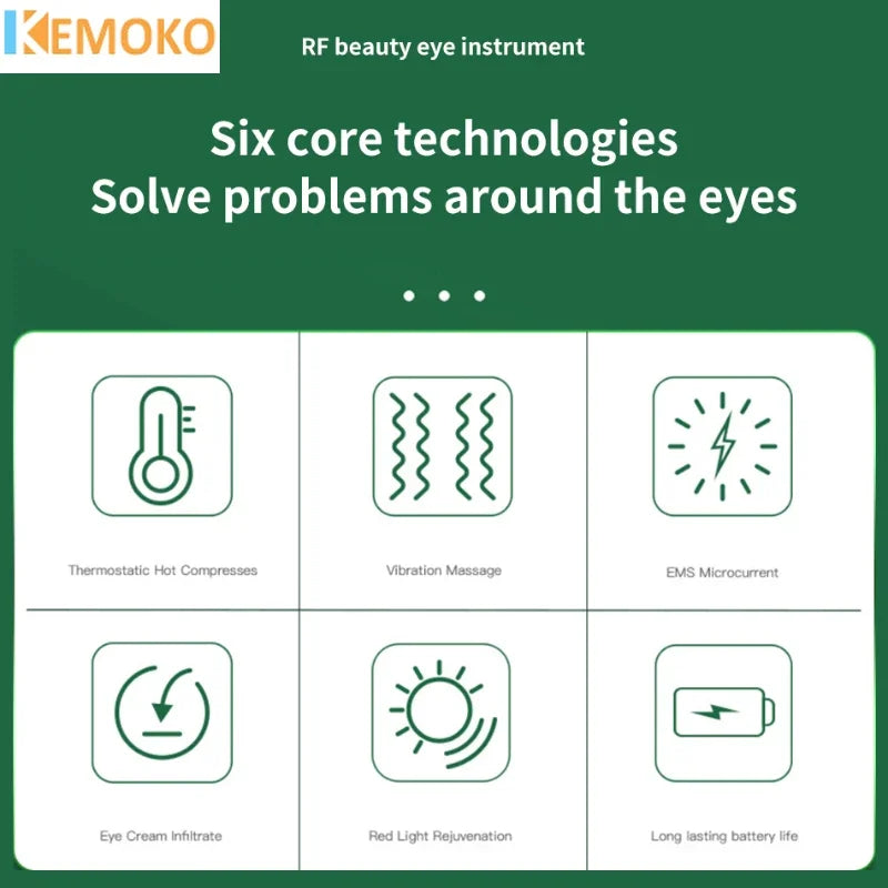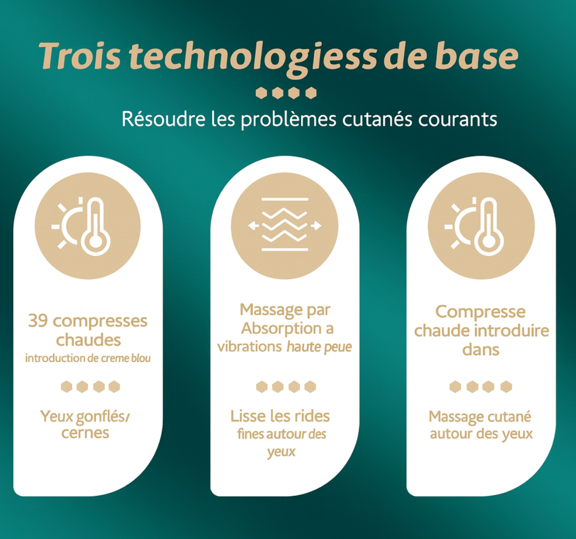 La chaleur douce à 40–42 °C favorise la micro-circulation et apporte une sensation de confort. Le froid procure un effet défatigant instantané et décongestionne les poches. La lumière LED rouge à 625 nm contribue à améliorer la fermeté et l’élasticité de la peau. Les micro-courants EMS associés aux vibrations tonifient en douceur et stimulent la peau, tandis que l’iontophorèse optimise l’absorption des soins.