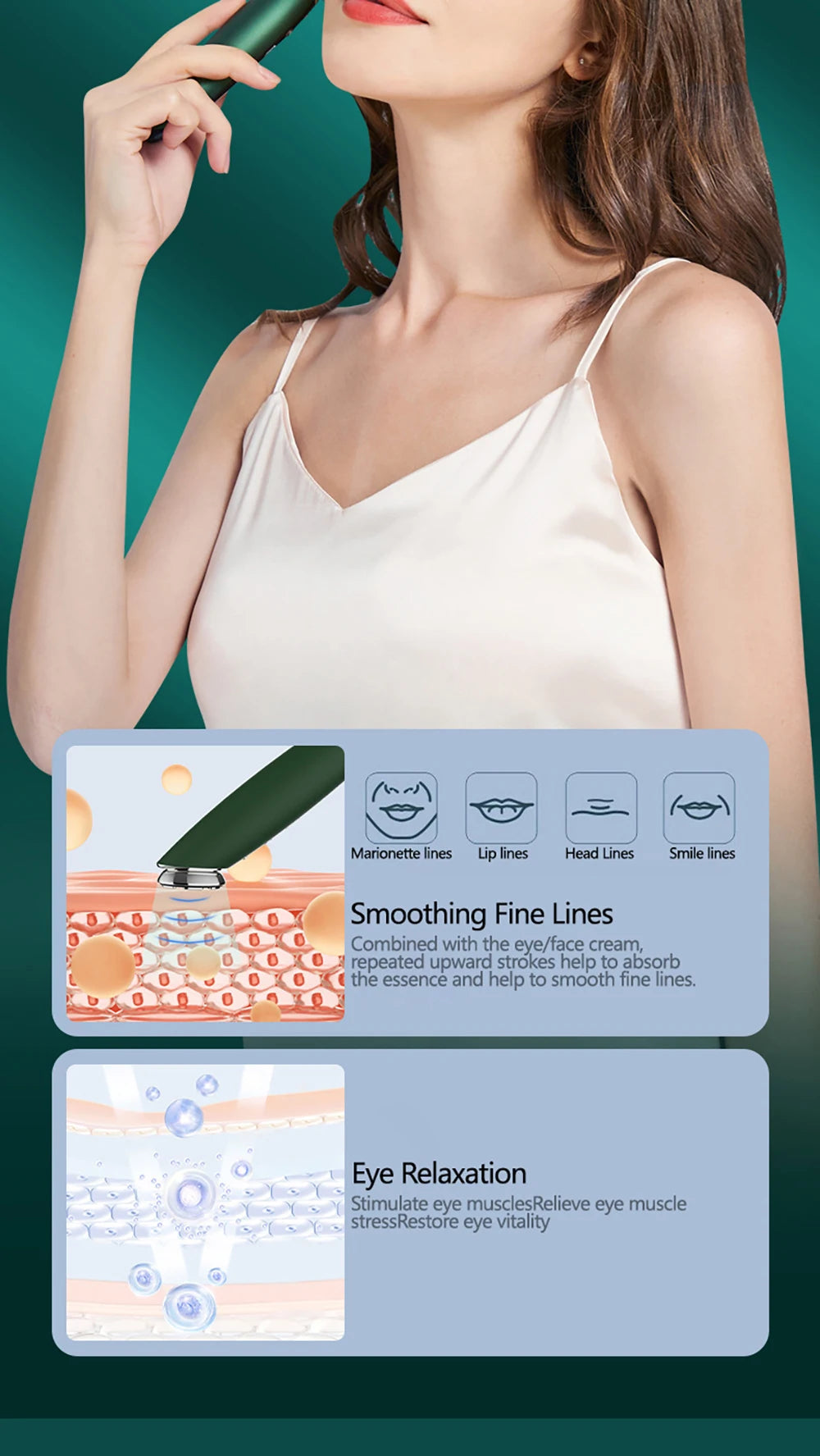 C’est un appareil de beauté nouvelle génération spécialement conçu pour cibler le contour des yeux, des lèvres et les zones marquées par les ridules. Sa technologie avancée associe chaleur, froid, LED rouge, micro-courant EMS et iontophorèse pour un soin global qui lisse, décongestionne et revitalise visiblement la peau.